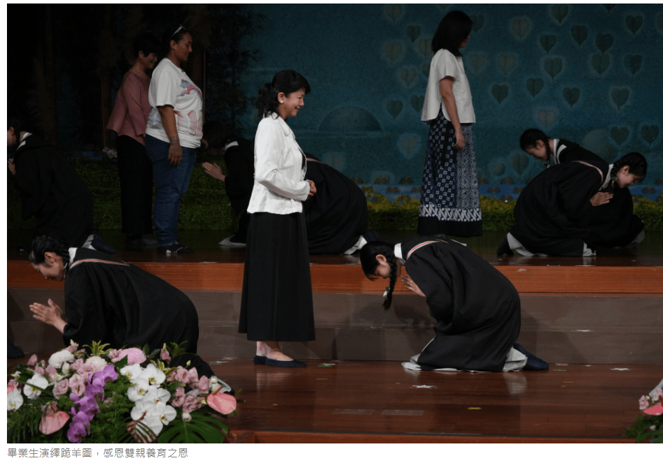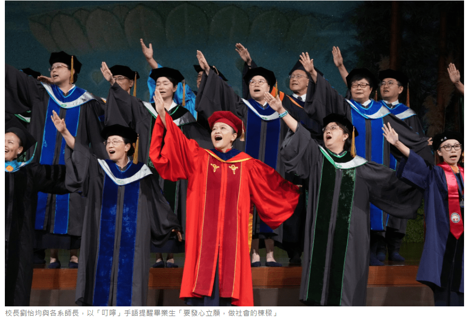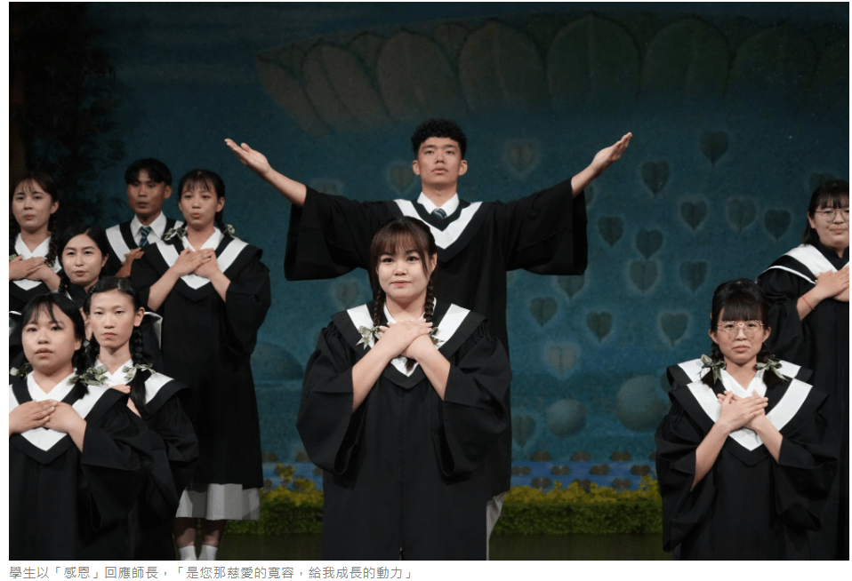校長劉怡均與師長們,透過手語「叮嚀」,提醒所有畢業生「要發心立願,做社會的棟樑」;「是您那慈愛的寬容,給我成長的動力。」學生以「感恩」回應師長,師生相互感恩,用誠摯的祝福,改寫離別的感傷。