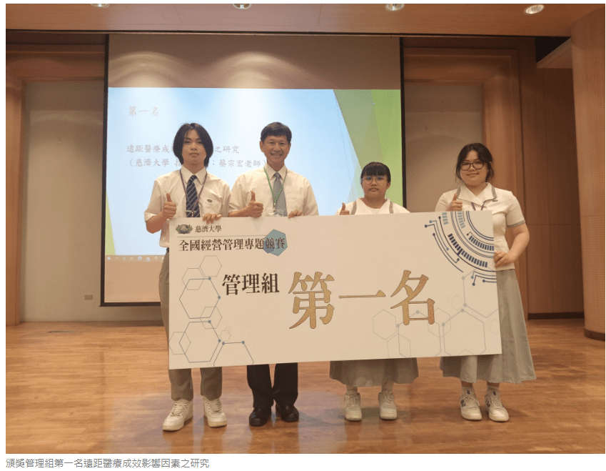 慈濟大學表現格外出色,不但勇奪12項大獎,其中,資訊科技與管理學系囊括資訊組第一名、第二名、第三名與5個佳作,管理組也獲得第一名;經營管理學系榮獲管理組第二名與佳作,醫務暨健康管理學系則奪得管理組佳作,再度展現慈大在實務導向教學與跨領域學習上的豐碩成果。