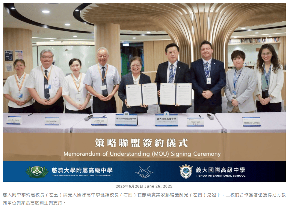 在全球教育快速變遷的趨勢中,花蓮慈大附中與高雄義大國際高級中學於26日日正式簽署「國際教育合作備忘錄」(MOU),攜手展開兩校跨區域、跨文化的教育合作,致力於共同推動高中教育的國際化發展,亦開東部與南部優質高中策略聯盟的新篇章。