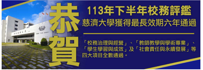 高等教育評鑑中心7月3日公布「113年下半年校務評鑑結果」,慈濟大學於「校務治理與經營」、「教師教學與學術專業」、「學生學習與成效」及「社會責任與永續發展」等四大項目全數通過,並獲得最長效期六年肯定。