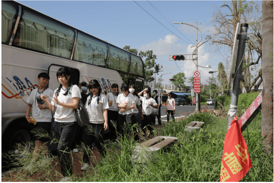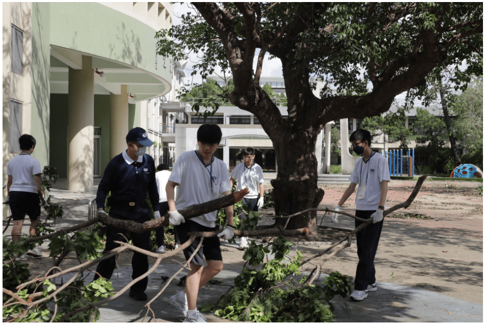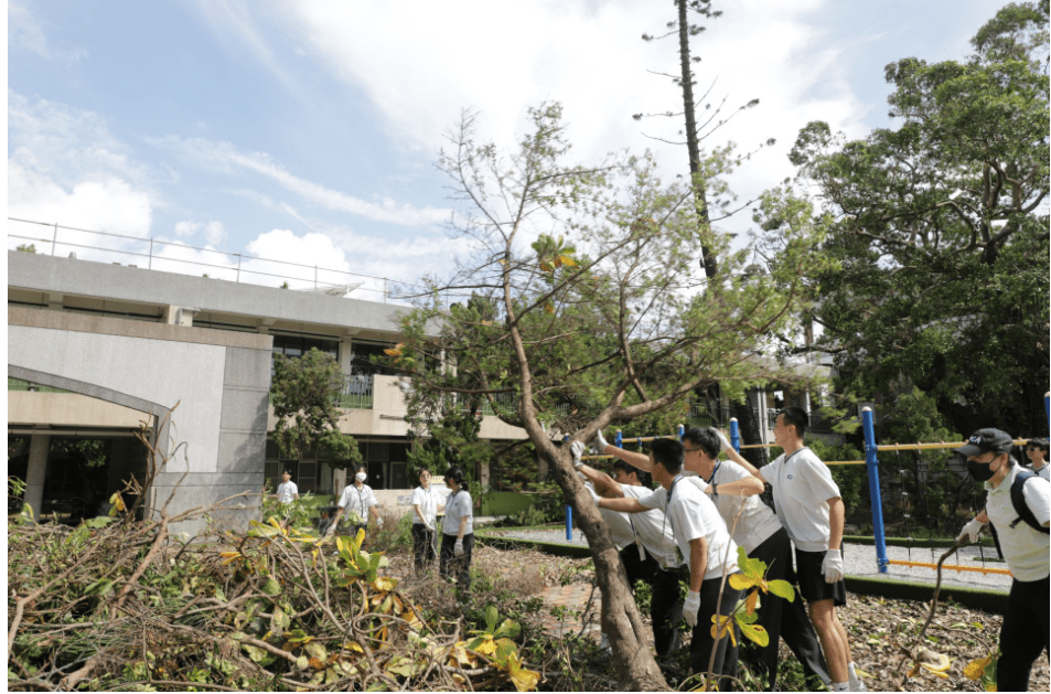 吳冠毅同學分享:「嘉義這邊的災情真的很嚴重,我們剛剛才一起處理一棵被連根拔起的大樹,那樹根還深埋在土裡,我們用盡全力才把它拔起來。我們那麼多人合力,都要花那麼多力氣。如果只有當地少數人來處理,真的很辛苦。所以我們來幫忙,覺得很有意義。雖然身體累,但我們真的很開心、也很願意付出。」
