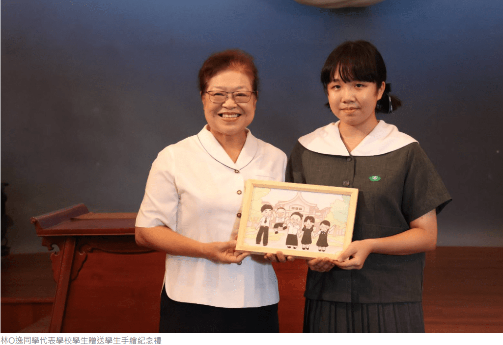 高中二年級的林芊逸也代表學生表達對李校長的感恩,芊逸分享:八年來每次的開學典禮上,校長姊姊總是叮囑兩件事:「第一印象很重要」以及「凡事提早五分鐘」——前者是人與人之間的尊重,後者是把握時光的方法。校長不只叮嚀,更以身教作為師生的典範,總是穿著整齊的制服,奔走在校園內外。她關心每一個學子,從已經畢業的學長姐、到國小的學弟妹,都像是自己的弟弟妹妹一樣如數家珍,每日早晨站在門口的揮手招呼、巡堂時的細心觀察,無一不展現出她的在乎和愛。在我國三面臨生涯選擇時,忙碌的她放下了公文,在校長室中關心我、替我分析,她溫暖的擁抱像是一團火光,溫暖我的胸腔,也點亮前方的道路。