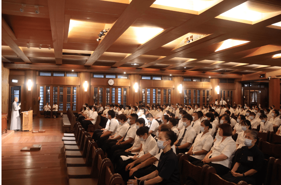 最後,幾位教師代表在「溫馨座談時間」跟上人分享自己與學生的學與覺, 陳昶伶老師分享從牽著自己孩子的手到牽起一群孩子的手,勇於傳承。周秋菊老師則分享將靜思語融入兒童英語劇教學的歡喜與感恩。江炳宏老師回顧自己的慈濟路,從成長於慈中時的嫌棄校規,到畢業回母校任教後方懂珍惜與同理學生。黃文怡老師分享慈中與美國緬因中央中學的雙聯學位交流,即使在自由的西方國度,仍溫柔堅持學習態度與手機使用規範。林惠瑩組長分享美國加州遊學團,看見青年參與公民議題的力量。吳思寰主任分享泰北國際志工服務經驗,用生命影響生命,也看見在異域堅守華文教學的菩薩身影,並實踐「SDGs」之永續理念。賴彥男組長以「捨我其誰」的態度前往新馬國際修學,不畫地自限,珍惜當下,看見生命的韌性。謝孟芬老師則分享在新馬國際修學中的城市探索與國際移動力。