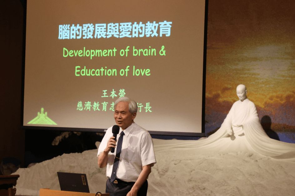 第二節課則由慈濟教育志業王本榮執行長分享「腦的發展與愛的教育」。王執行長說大腦的發展是先突飛猛進,再雕琢成型,70%的腦部是出生後因應環境變化,透過後天經驗學習發展而成。因此,孩子的學習黃金期就交在我們手上,顯示家庭教育和學校教育的重要。青春期是腦的雕塑期,對同儕、自我感會發生很大變化,如何照顧好孩子的心智與身體、關懷他們的思想與情緒,就需要愛的教育,能為他們帶來信任、希望與幸福。慈濟的人文教育就是愛的教育,重視生活教育與態度,指導孩子如何做人、如何生活,而AI時代的教育愛,更是引導學生與AI共創形成新能力,老師要引導創意、鼓勵反思,教出不被AI取代的人才,著重教導學生生命的價值與意義。
