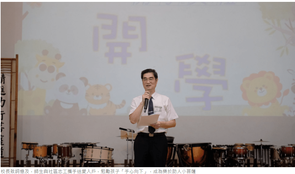 姚智化校長介紹新進教師,老師們逐一揮手致敬,台下與孩子們建立親切的第一眼緣。校長致詞中特別憶及暑假丹娜絲颱風,師生與社區志工攜手送愛入戶,點亮黑暗中的希望之燈。他勉勵孩子學習「手心向下」的精神,樂於助人,成為小菩薩。