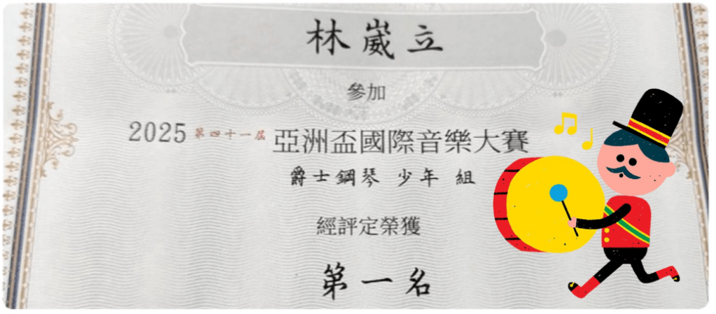 音樂方面,國中一年級林崴立同學在亞洲盃國際音樂大賽(Asia Cup International Music Competition)中勇奪爵士鋼琴少年組第一名。林崴立從小熱愛音樂,尤其擅長即興與旋律表達,此次比賽中以靈動的指尖與穩健節奏展現成熟的音樂感受力。校內打擊樂校隊也將於11月1日代表學校參加臺南市114學年度學生音樂比賽,持續展現團隊默契與青春活力。