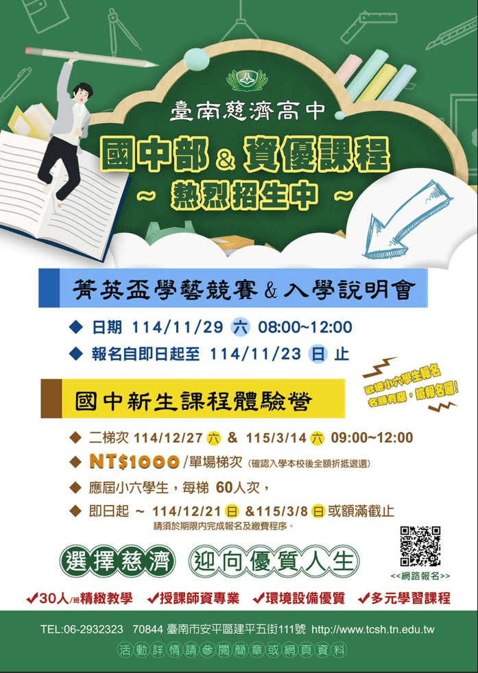 臺南慈濟中學將在11月29日(六)辦理國小六年級菁英盃學藝競賽及OPEN SCHOOL 入學說明會。詳細資訊請見學校網頁:https://www.tcsh.tn.edu.tw/