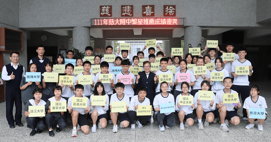 台大、清大、成大、陽明交大、政大還有兩位中、西醫學系,慈大附中應屆學生參加111年度大學繁星推薦表現優異,超過25%畢業班學生錄取心目中第一志願的頂尖大學校系,共有44位學生錄取國內頂尖公私立大學,其中19同學位順利推甄上台清交等頂尖國立大學,包含錄取臺灣大學法律系的葉承恩、清華大學生命科學系的陳寬宇、陽明交通大學資訊工程系的黃哲宇及通過慈濟大學醫學系第一階段篩選的樊蓁蓁等。全校親師生同賀順利通過大學繁星推薦及特殊選才,提早成為大學生的49位同學。